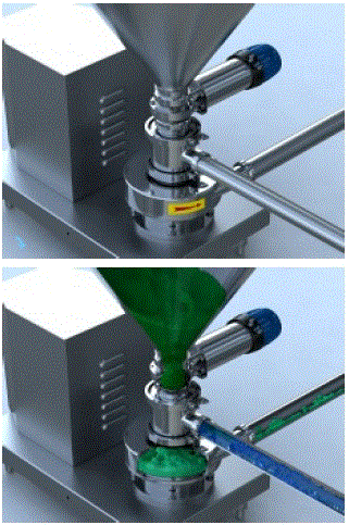Simple and versatile assembly for quick and homogeneous mixing of a great variety of solids without contact with the air. Complete mixing with recirculation of the material. In some applications, itcan be used in line, without recirculation.