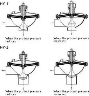 HY2-1 sanitary constant pressure valve is open when the product pressure increases and vice versa. HY2-2 sanitary constant pressure valve is closed when the product pressure increases and vice versa. (The operating principle is shown as follows.)